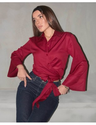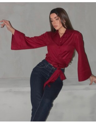 Chemise en popeline croisée, élégante et féminine, avec nœuds qui s’enroulent autour de la taille pour une silhouette structurée et moderne. Tissu léger et agréable à porter, parfaite pour un look chic au quotidien ou une tenue habillée.