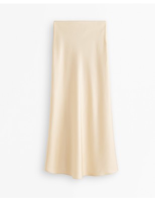 Jupe maxi en satin de soie écru au fini brillant, dotée d’une coupe évasée qui épouse délicatement les formes et allonge la silhouette. Un essentiel chic et tendance pour vos looks de jour comme de soirée.